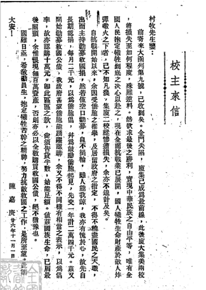 1937年11月1日陈嘉庚致集美学校函(登载于《集美周刊》,公开发表的内容为陈嘉庚原信改编) 他发出为国家大义毁家纾难的宣言:“国难日亟,希激励员生,抱定牺牲苦干之精神,努力抗敌救国之工作,是所厚望!”在学校被迫内迁办学的1938年,陈嘉庚“辛苦万状”建设起来的煌煌黉宇惨遭日本侵略军破坏。11月12日陈嘉庚来函强调面对侵略即使代价巨大也绝不屈服:“集美校舍之损失,在战事未了之前,不能算损失若干。如再战二三年,或全校破碎,抑日寇退走之时更形破碎亦未定。然我以焦土抗战,不论如何绝无痛惜,唯有胜利之后,不患无更加光荣也”。