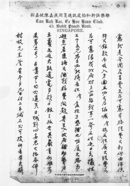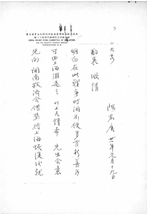 1932年7月7日陈嘉庚致叶渊函 1937年全面抗战爆发,陈嘉庚临危受命,担任新加坡“星华筹赈会”主席;1938年更以舍我其谁的勇气和担当,当选为“南洋华侨筹赈祖国难民总会”主席。他振臂高呼,“领导南侨捐抗敌,会场鼓励必骂贼,报章频传海内外,敌人恨我最努力”。