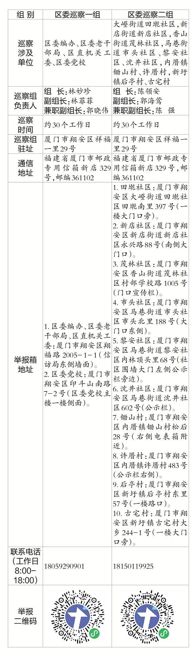 五届翔安区委第八轮第一批巡察展开 厦门日报讯(记者 曾嫣艳 通讯员 柳舒瑜)根据《中国共产党巡视工作条例》《关于市县党委建立巡察制度的意见》《中共翔安区委巡察工作实施办法》以及省、市、区委相关规定和部署要求,经中共翔安区委巡察工作领导小组研究决定,自2025年9月1日起对区委编办、区委老干部局、区直机关工委、区委党校开展常规巡察,对大嶝街道田墘社区等10个重点村(社区)开展市区联动巡察“回头看”。