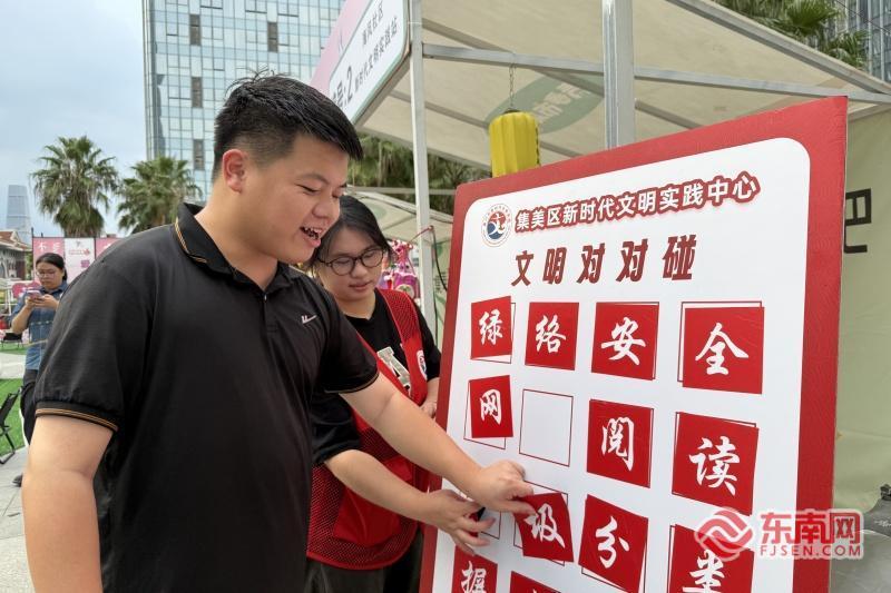 “文明对对碰”游戏互动(东南网记者 李霖 摄) 文明宣传 引领婚恋新风尚 活动特别设立文明实践专区。 “婚嫁从简,幸福不减”“为彩礼减负,给新人添福”……集美区新时代文明实践中心工作人员现场倡导简约适度、高雅温馨的婚恋观念,还设置“文明对对碰”游戏互动、“文明‘塑’递员”空瓶回收站,邀请居民游客以文明宣传行动赢好礼。 一旁,手袋、发夹、摆件等各色钩织手工艺品摆满了海凤社区新时代文明实践站爱心义卖摊点。这些钩织作品均出自海凤社区编织工作坊,由社区热心居民手工创作。工作坊工作人员林翼告诉记者,此次义卖所得将用于后续走访敬老院、特殊儿童家庭,推动公益可持续。 “我们希望通过参与此次活动,传递新时代文明新风,同时助力公益事业,实现浪漫与公益的双向奔赴。”集美区新时代文明实践中心工作人员表示。 中共集美区委文明办相关负责人表示,本次七夕活动以创新形式融合表演、市集与文明宣传,再现中华传统节日的文化内涵,更充分展现集美区在推动文化传承、婚俗改革和新时代文明实践中的积极探索,让市民在感受浪漫的同时,共筑文明新风。 此次活动由中共集美区委宣传部、中共集美区委文明办、共青团集美区委员会、集美区妇女联合会、集美区文化和旅游局、集美区民政局联合主办,集美区文化体育事业服务发展中心、集美区新时代文明实践中心、集美区文化馆承办。 |