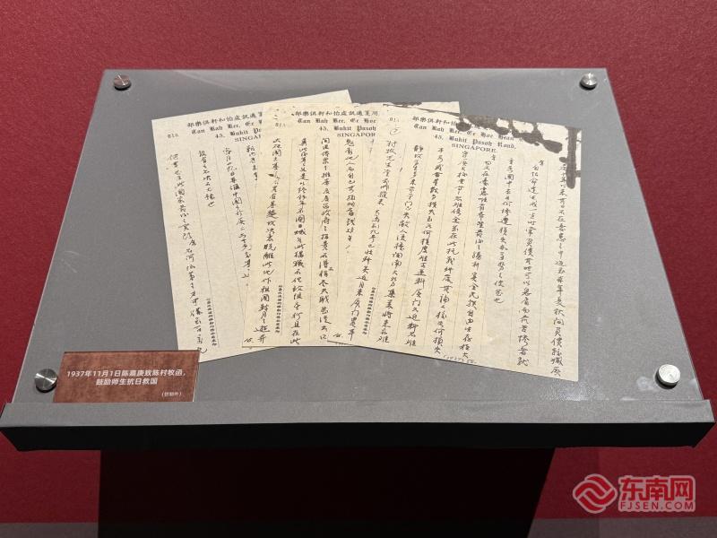 “烽火侨心——陈嘉庚与南侨机工”展开启预展。(东南网记者 李霖 摄) 东南网9月4日讯(本网记者 李霖 通讯员 沈鹭璐)为纪念中国人民抗日战争暨世界反法西斯战争胜利80周年,铭记历史、缅怀先烈,传承和弘扬嘉庚精神,9月3日下午,“烽火侨心——陈嘉庚与南侨机工”展在陈嘉庚纪念馆开启预展。展览将于10月21日正式开幕。 “烽火侨心——陈嘉庚与南侨机工”展览分为“赤子同心筑长城”“应召归国赴使命”“铁血征途铸丰碑”“山河重光志长存”四个部分,讲述了爱国华侨领袖陈嘉庚汇聚侨心、纾难救国的故事。 抗日战争时期,陈嘉庚高举南侨抗日旗帜,汇聚起广大南洋华侨磅礴的爱国力量,支援祖国抗战。3200余名南侨机工响应陈嘉庚的号召毅然回国,投身关乎民族存亡的抗战运输线,谱写了可歌可泣的壮丽篇章。其中,千余人为国捐躯,长眠于滇缅公路。 此次展览不仅展出了陈嘉庚写给集美学校校董陈村牧的“抗战侨批”,他对于南侨机工的“牵挂信函”以及在避难期间写下的《述志诗》,呈现了他在南洋奔走呼号、组织华侨支援祖国抗战的感人事迹,生动再现了这位华侨领袖的赤诚之心与家国担当。 此外,此次展览还展出了南侨总会“七七”纪念章、南侨机工符修治回国使用的行李箱、南侨机工吴惠民回国穿的皮鞋,以及陈清林、何再添、林上梯、黄玉生4位厦门籍南侨机工的复员登记表等一批珍贵文物,凸显出地域华侨群体的抗战印记。 此次展览由陈嘉庚纪念馆主办,中国华侨历史博物馆、云南省档案馆、昆明市博物馆、厦门市归国华侨联合会、马来西亚陈嘉庚纪念馆、厦门国际银行、香港集友银行联办,华侨博物院、集美鳌园景区协办,德宏职业学院支持。
