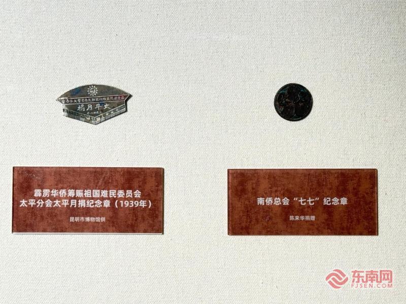 霹雳华侨筹赈祖国难民委员会太平分会太平月捐纪念章(1939年)、南侨总会“七七”纪念章(东南网记者 李霖 摄)