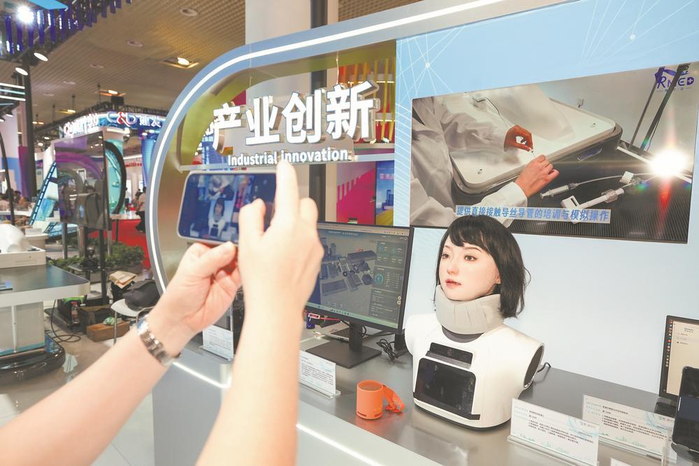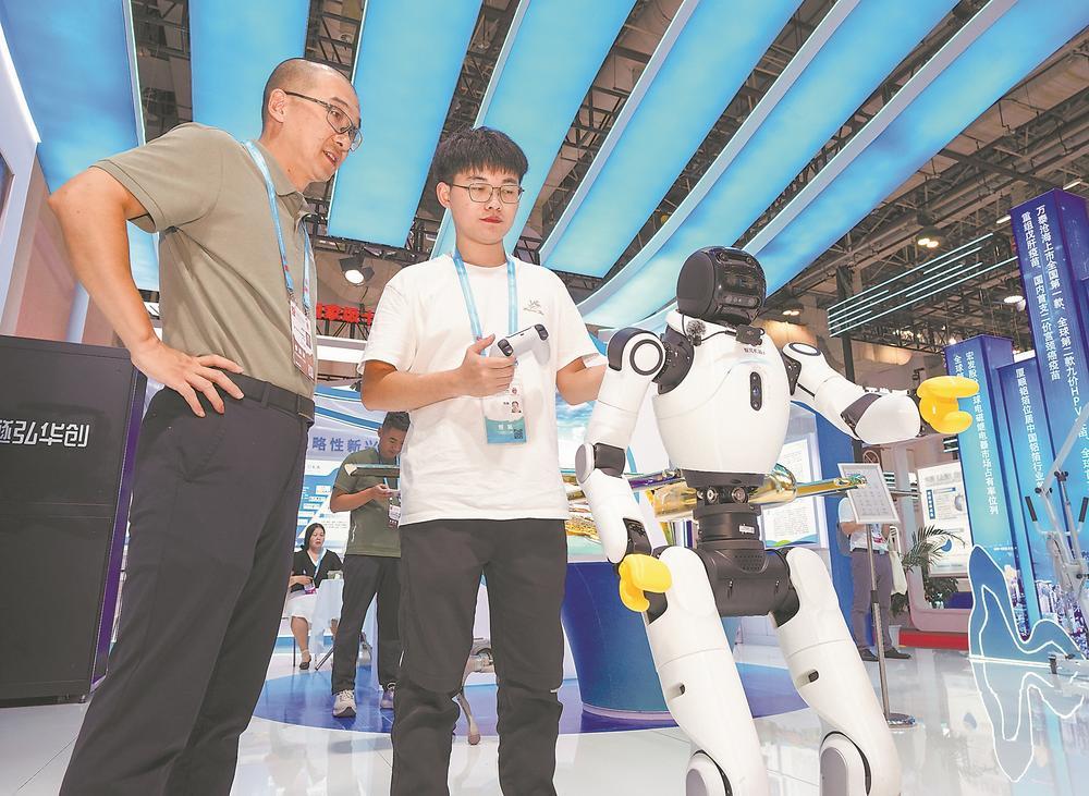 厦门海沧展区内,工作人员正在操控智元机器人。