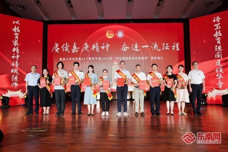 集美大学庆祝第41个教师节暨2025年“学生最喜爱的优秀教师”颁奖典礼(集美大学团委供图) 东南网9月10日讯(通讯员 张怡园)9月9日晚,集美大学举行庆祝第41个教师节暨2025年“学生最喜爱的优秀教师”颁奖典礼,为“学生最喜爱的优秀教师”称号获得者及提名奖获得者颁奖,向全校教师送上节日的祝福和浓浓的敬意。 颁奖典礼以“以教育家精神铸魂强师,谱写教育强国建设华章”为主题,分为“赓续初心使命”“坚守教育情怀”“奋进一流征程”三个篇章,采用情景表演、演讲朗诵、视频祝福等多种形式,刻画了学校教师牢记为党育人、为国育才的教育使命,争当“四有”好老师的生动形象。 此次活动以学生为评价主体,采取自下而上的推选方式,经过班级和学院评选两个环节,推选出学生最喜爱的优秀教师候选人,再通过网络和学生专场投票的方式进行校级评选,最终评选出“学生最喜爱的优秀教师”。 据悉,该校已连续十一年在教师节前夕开展“学生最喜爱的优秀教师”评选活动,积极营造良好的教书育人氛围,弘扬尊师重教传统美德,树立起集大好老师的时代新形象。 |