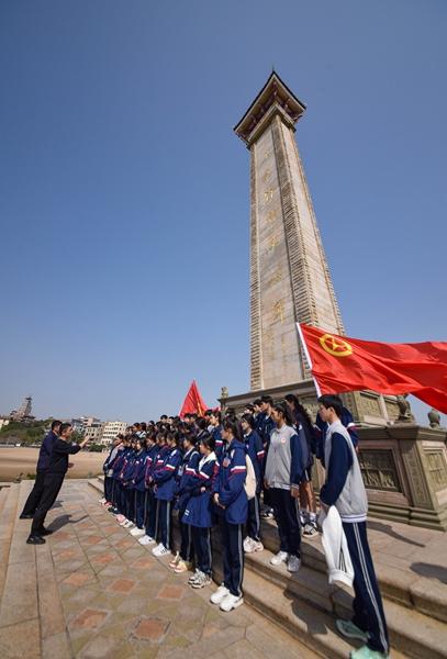 嘉庚学子在集美解放纪念碑开展爱国主义教育。(资料图) “这些小讲解员不仅在复述史实,更在传承一份历久弥新的精神信念。”如今在集美学村,嘉庚精神已融入学校教学课程;每年开学季,一批批新生的第一堂课都会到鳌园、陈嘉庚纪念馆瞻仰学习,继承和发扬“忠公、诚毅、勤俭、创新”的嘉庚精神。(记者 林志杰 来源:集美报)