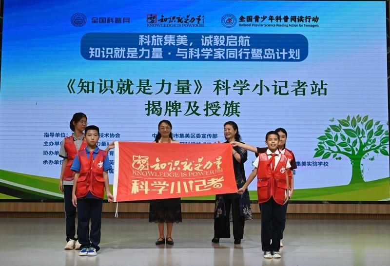 《知识就是力量》科学小记者站授旗。(冯立东 摄) 9月11日,由《知识就是力量》杂志社、区科协主办的“科旅集美,诚毅启航——全国青少年科普阅读行动”走进凤安社区,《知识就是力量》科学小记者站凤安社区站正式启动。此次活动作为“知识就是力量·与科学家同行鹭岛计划”的重要举措及全国科普月集美区主场配套活动,在福建教育学院附属集美实验学校美山分校拉开帷幕,标志着区科协以社区为核心、联动周边学校的科普创新模式正式落地,为青少年搭建了一个融合科普阅读与科学探究实践的综合性平台。区委常委、宣传部部长庄志辉参加启动仪式。 活动首创“1+5”社校联动模式,由凤安社区牵头,联合集美中学、福建教育学院附属集美实验学校及美山分校、乐海小学、乐海幼儿园5所校园,打破传统科普活动的场景局限。通过整合社区与学校资源,实现 “科普进社区、进校园”双向赋能,构建“社区-学校-家庭”三位一体的科普生态圈。 启动仪式上,区科协向凤安社区及合作学校赠送《知识就是力量》杂志,为青少年播撒科学种子。《知识就是力量》杂志社社长、主编郭晶表示,将以“行走阅读+科旅融合”模式,让科普与科学教育更具生命力。厦门市教育基金会理事长潘世建结合厦门海洋文化与嘉庚精神,强调小记者站不仅是科普平台,更是传承“诚毅”精神、培养海洋保护意识的载体。 据了解,科学小记者站将组织青少年参与给科学家写信、科旅研学等活动,依托杂志平台发表实践成果。集美区科协负责人杨志伟表示,此举旨在打通科普“最后一公里”,未来将持续深化“社校联动”模式,打造全国科普教育标杆,为青少年科学素养提升提供可复制的“集美经验”。(记者 冯立东 来源:集美报) |