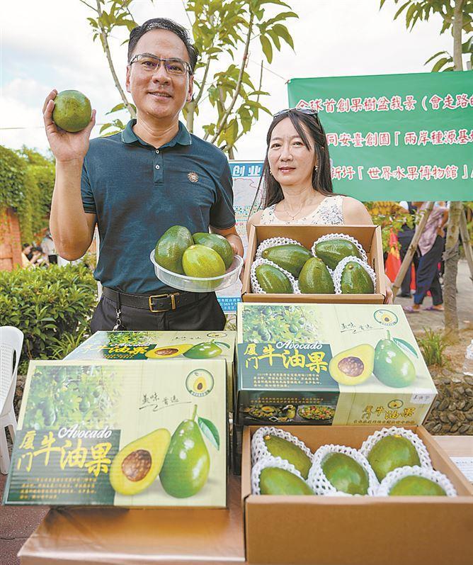 台农龚世明(左)携牛油果加入丰收节摊位,现场推荐产品。