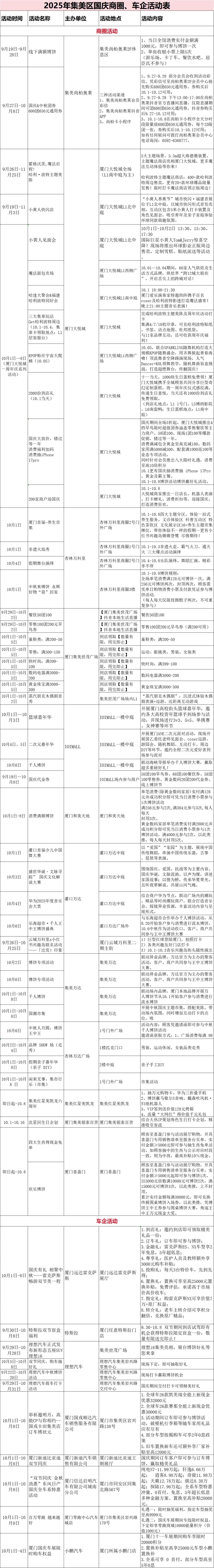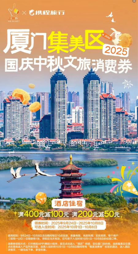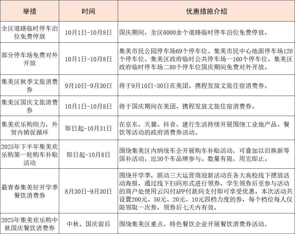 Part05 暖心惠民 多重福利齐发 假日期间 从消费补贴到出行保障 集美区将通过 一系列贴近市民游客需求的惠民举措 让大家感受 “轻松消费、便捷出行、舒心游玩”的 “集美好”文旅体验 区商务、文旅部门联合美团、携程平台、地铁生活圈发放30万元文旅住宿消费券及10万元餐饮消费券,覆盖酒店住宿、特色餐饮等场景,市民游客可在“地铁生活圈小程序”领取使用,直接抵扣消费; 厦门大悦城、集美尚柏奥莱、IOI MALL、集美世茂、集美万达等商圈以及集美远达雷克萨斯、特斯拉、新迪汽车、理想等车企也将推出更多折扣优惠。