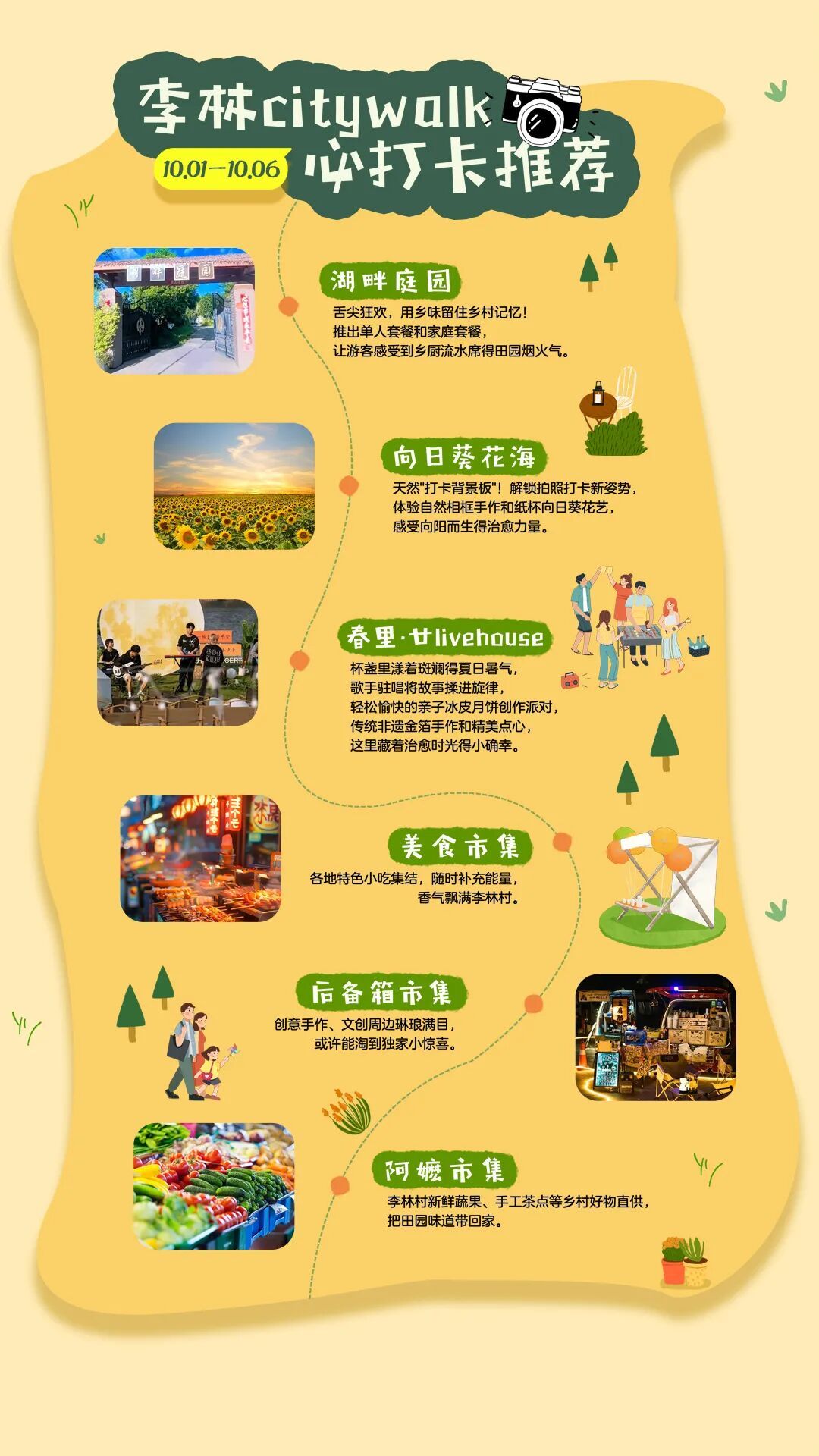 活动攻略来咯! 6 天特色盛宴启幕!等你来赴约 2025 年 10 月 1 日 - 6 日 09:00-18:00 李林村6大特色活动天天热闹开场! 阿嘛市集、美食市集、后备箱市集互通活力 手作与美食交织香气 慢慢逛,满是热闹的城乡联动气息 更有烂漫向日葵花海作伴 让每一段逛集时光都浸满秋日温柔