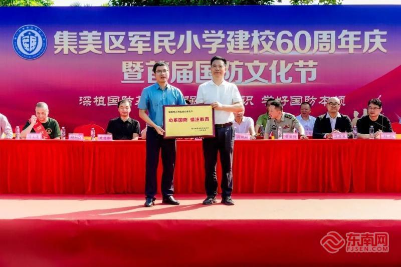 集美区军民小学举办建校60周年庆暨首届国防文化节活动现场(主办方供图) 东南网10月1日讯(本网记者 李霖 通讯员 许启明)时值中国人民抗日战争暨世界反法西斯战争胜利80周年,9月30日,作为教育部认定的国防教育特色学校,集美区军民小学举办建校60周年庆暨首届国防文化节活动。活动通过沉浸式国防教育体验,进一步增强学生的国防观念和国家安全意识,弘扬爱国主义精神,展现了新时代军民融合育人的丰硕成果。 砥砺前行 军民融合育人成果丰硕 庆典在庄严的国歌声中拉开序幕,全场人员齐声高唱,心潮澎湃。随后,学生方阵身着统一迷彩服,迈着铿锵步伐入场,以一场气势如虹的军体拳表演将活动推向高潮。孩子们整齐划一的动作、震天动地的口号,不仅展现了强健的体魄,更彰显了坚韧不拔、纪律严明的军人气概,是“军民精神”在新时代学子身上的生动写照。 在校园小讲解员们的引导下,与会嘉宾还参观了特色国防教育文化展。从丰富的军事模型到随处可见的军事科普文化墙,再到学生们亲手制作的主题手工作品,生动讲述着从“小米加步枪”到“大国重器”的强国征程。 校方表示,学校始终坚守“为党育人、为国育才”的初心,践行“崇德、启智、健体、尚美”的育人追求,将爱国情怀与军人品格深深融入办学基因。