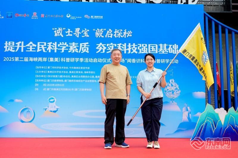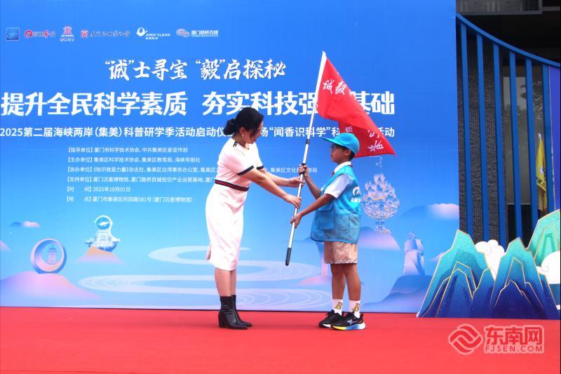 诚毅科普小记者团授旗仪式(东南网记者 李霖 摄) 诚毅接力 小记者团肩负新使命 开幕式上,诚毅科普小记者团再次集结。作为科普研学季的重要活动之一,2025年第二届集美区诚毅科普小记者训练营此前已于福建教育学院附属集美实验学校美山分校开营。 小记者代表、集美区窗内小学六年级学生刘隽希回顾了首届研学季的收获:“每一次采访,每一次探索,都让我深刻体会到‘诚毅’精神的力量,更明白了肩上作为科学传播小使者的责任。”科普研学季期间,小记者们将深入集美区20余个科普教育基地,用笔和镜头记录科技的魅力,讲述科学故事,传递集美科普研学的魅力。 现场,厦门沉香博物馆馆长、闽南香制作技艺非遗传承人廖木森分享了香道文化的传承与创新,并接受了诚毅科普小记者们的采访。 “一缕沉香,穿越古今,更连接两岸。”廖木森表示,希望通过科普研学活动,让大家知道,沉香不仅是名贵的香料,更是一部“自然的教科书”。它揭示了生态平衡的重要性,诠释着“厚积薄发”的人生哲学。学习沉香知识,能培养审美情趣,提升文化自信,更能在孩子们心中种下一颗敬畏自然、珍视传统的种子。 2025第二届海峡两岸(集美)科普研学季由厦门市科协、集美区委宣传部指导,集美区科协、集美区教育局、海峡导报社联合主办,《知识就是力量》杂志社、集美区台办、集美区关工委、集美区文旅局共同协办。