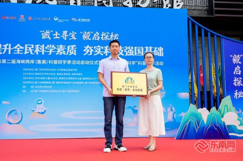 2025第二届海峡两岸(集美)科普研学季开幕式(东南网记者 李霖 摄) 东南网10月1日讯(本网记者 李霖)嘉庚故里,香韵悠长。10月1日上午,在厦门沉香博物馆,两岸亲子家庭代表和与会领导嘉宾共同将天然沉香纯露注入启动台,随着袅袅香气升腾,“鼻观科学 香照传承”八个大字缓缓浮现,标志着2025第二届海峡两岸(集美)科普研学季正式拉开帷幕。 去年,首届海峡两岸(集美)科普研学季创新模式,获评中国科协“全国科普日优秀活动”称号。适逢首个“全国科普月”,本届研学季以“提升全民科学素质 夯实科技强国基础”为主题,活动规模与深度全面升级。来自厦门市、集美区的相关领导、嘉宾,以及近50组两岸亲子家庭齐聚,共同翻开集美科普研学的新篇章。 搭建平台 推动两岸科普交流 活动伊始,一场庄重雅致的《中华香礼》表演,将流传千年的中华香道文化娓娓道来,为本届研学季奠定了传统与现代、文化与科学交融的基调。 集美区科学技术协会负责人杨志伟在致辞中回顾了首届活动的丰硕成果,并阐述了本届研学季的深远意义。“去年,我们成功盘活串联了全区20家科普教育基地,通过诚毅科普小记者团、两岸青少年交流等特色活动,打造了集美科普的亮丽名片。“今年,我们迎来首个‘全国科普月’,使命更重,目标也更清晰。”杨志伟说。 本届研学季聚焦三大核心目标:其一,弘扬科学精神,通过沉浸式科普体验,激发青少年对科学的好奇心与探索欲;其二,深化两岸融合,以科普为纽带,搭建两岸青少年交流的桥梁,增进文化认同与情感共鸣;其三,系统盘活资源,持续整合辖区20余家科普教育基地,构建“科普+文旅+产业”的全域科普生态,推动集美科普教育从“单点突破”迈向“系统赋能”。 “我们精心搭建的这座科普之桥,旨在将两岸紧密相连,让更多孩子‘爱科学、学科学、用科学',让集美的科普资源真正‘活起来、火起来',为科技强国建设贡献基层力量,助力两岸文化交流。”杨志伟说。