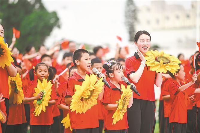 孩子们在老师带领下深情演唱红歌。(记者 林铭鸿 摄) 厦门日报讯(佘峥 通讯员 吴竞羽)昨天上午,厦门市火炬学校近千名学生、家长和老师参加升旗仪式,齐唱红歌。 到学校升完国旗,再开启国庆假期,是这所民办学校的传统——学校办了24年,国庆升旗仪式也举行了24年。 该校创校校长王哲红认为,学校每周都在升国旗,如果在国庆之日因放假而没有举行升旗仪式,是一种遗憾。因此,2001年火炬学校创办后,定下了国庆节学校必须举行升旗仪式的制度,学生自愿报名参加。一开始只有100多人到校,后来慢慢多了,现在每个班级给八九个名额,“有的班级要靠抢”。 昨天早上,在国歌声中,初中学生组成的国旗护卫队将国旗升至旗杆顶端。学校党总支书记胡志铭发表了国旗下的讲话,学生们分为四个方阵唱红歌,包括《祖国祖国我爱你》等。最后,全场师生家长合唱《歌唱祖国》。 和往年一样,不少学生家长也跟孩子一起参加学校的升旗仪式,基本上一家三口是“标配”。五年级学生朱瑾轩的奶奶穿着旗袍赶来参加,朱瑾轩说,现场参加国庆升旗仪式,更有氛围。 火炬学校说,国庆当天升国旗、唱红歌,已经成为学校爱国主义教育的一个重要组成部分,引导孩子们从小“扣好人生第一粒扣子”。 |