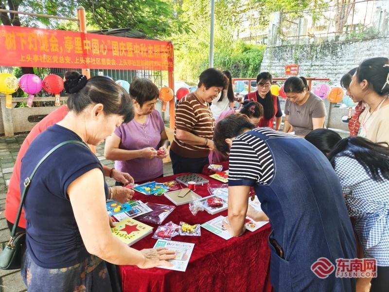 “月满中秋・礼赞祖国”国庆节主题游园活动现场(叶厝社区新时代文明实践站供图) 趣味游园 传递民俗韵味 月满中秋,情系家国。叶厝社区新时代文明实践站联合海宝幼儿园开展“双节同庆”活动,师生共绘百米画卷,将对祖国的美好祝愿融入斑斓色彩。孩子们还体验了博饼、月饼制作等传统民俗,在互动中感受中华文化的魅力。 上头亭社区新时代文明实践站在三榕公园举办“树下灯谜会,亭里中国心”游园活动,猜灯谜、套圈游戏、手工制作等项目轮番上演,居民们在欢声笑语中共抒爱国情、共话团圆意。 顶许村、后垵村、东辉村、马銮社区等实践站则以手工制作为纽带,组织青少年扎制花灯、亲子竹编、制作风车灯笼等,让家国情怀在指尖传递。黄地村、港头社区新时代文明实践站聚焦老年群体,指导老人制作折纸灯笼、绘制“锦绣山河”主题团扇,大家在品月饼、忆老歌中共度温馨时光。