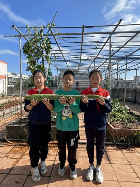 孩子们认真观察、记录种植过程。 现场,原创科学情景剧《共赴星辰之约》精彩上演。该剧以中学生“小毅”的梦境为主线,穿越时空与孙思邈、万户、钱学森等科学先驱展开对话,引导小观众深入思考“科学真谛”内涵。西亭学校合唱团还倾情演唱了中国首部太空实拍电影《窗外是蓝星》的主题曲,用歌声传递航天梦想的温暖与力量。 集美区太空植物种植大赛自2018年启动以来,已成功举办六届,累计覆盖全区超过70所中小学及幼儿园,吸引近5000名师生参与。本届大赛由区科协、区教育局主办,共有66所学校(校区)、244支队伍参与到赛事中。首次设置的“太空盲盒”种植环节,更为比赛增添了趣味与悬念。据统计,本届比赛共收获太空丝瓜120棵、太空航茄35棵、太空香炉南瓜11份,其中更诞生了151.2厘米的“最长丝瓜”、810克“破纪录航茄”、1010克“最重南瓜”等亮眼成果。孩子们在种植过程中认真记录数据、细致观察植物生长变化,展现出嘉庚学子在劳动实践与科学探究中的成长与突破。