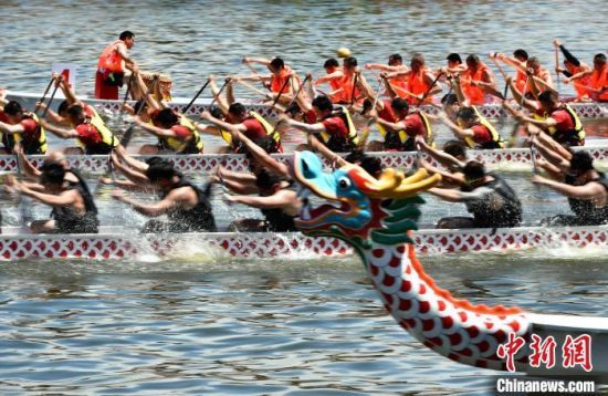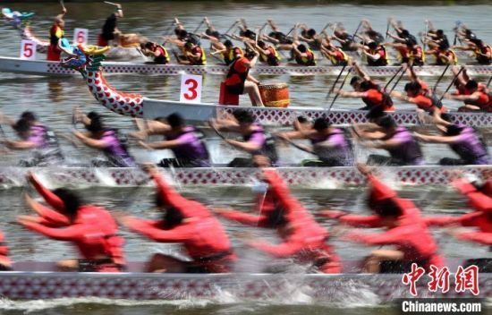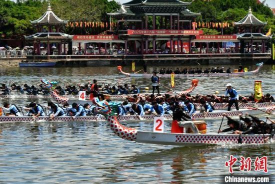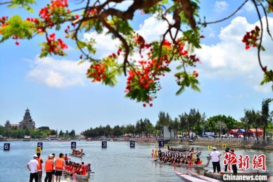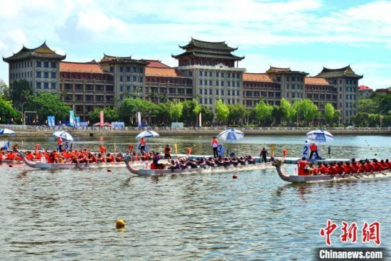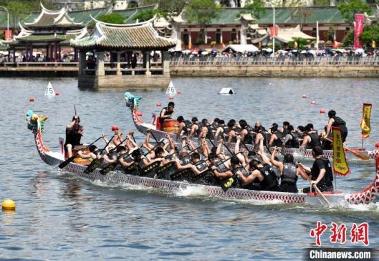 5月17日,参赛队伍在海峡两岸龙舟赛中角逐。中新社记者 张斌 摄