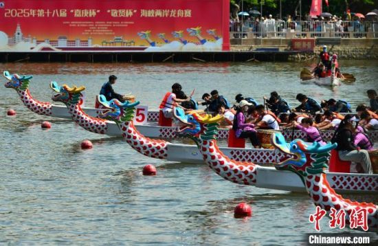 5月17日,2025年第十八届“嘉庚杯”“敬贤杯”海峡两岸龙舟赛在厦门集美龙舟池举行,共有36支队伍参赛,其中大陆队伍27支、台湾队伍9支。中新社记者 张斌 摄