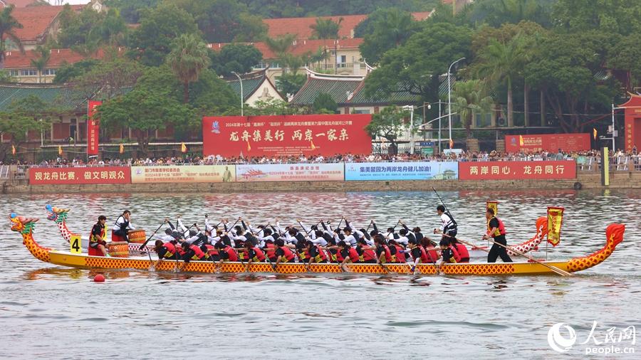 2024年海峡两岸龙舟赛女子组总决赛现场(资料图)。人民网记者 陈博摄 “十九载奋楫争先,十九年同心筑梦。”庄志辉表示,自2006年首桨击水以来,这项由陈嘉庚先生亲手培育的龙舟赛事,已从地方民俗活动成长为国家级品牌赛事,其不仅是同舟共济吹响的激昂号角,更是两岸同胞血脉相连的生动写照。作为嘉庚教育遗产申遗的重要载体,本届龙舟赛将以桨为笔、书写文化传承新篇章,以舟为媒、谱写两岸同源新乐章,以赛为引、绘就美好生活新画卷,“以龙舟为舟、以文化为桨,在集美这片充满人文底蕴的土地上,架起两岸交流的连心桥,共同书写两岸融合发展的新篇章,为传承和弘扬中华优秀传统文化、助力嘉庚教育遗产申遗贡献更大力量;将充分整合文旅资源,展现集美美好生活图景,让海内外朋友既能感受赛龙舟的激情澎湃,又能全方位领略集美的人文底蕴和现代活力,在桨声灯影中感受‘一精神三文化’的独特魅力。” |