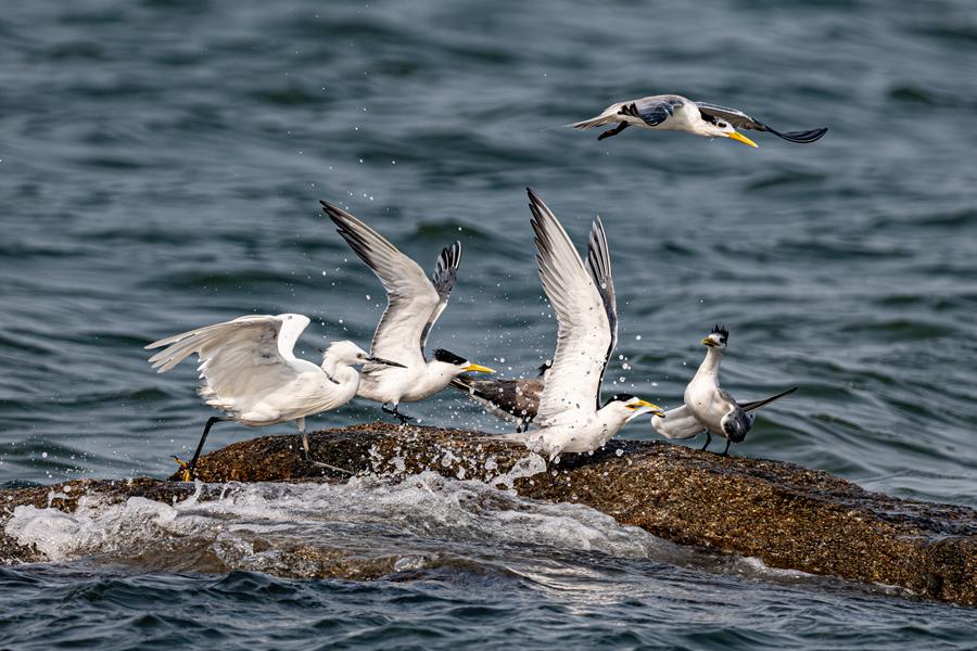 大凤头燕鸥在海面上追逐飞行。陈婧怡摄 正午时分,在厦门集美鳌园景区,已有不少观鸟爱好者聚集,他们将镜头对准百米开外的一块礁石,正是大凤头燕鸥鸟群的落脚点。阳光下,海面上波光粼粼,这群“海岸精灵”时而踏浪嬉戏,时而飞向大海追逐鱼群,它们发现猎物后会迅速俯冲捕食,溅起层层水花,观鸟爱好者们纷纷举起相机记录下精彩瞬间。