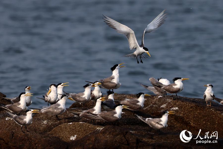 大凤头燕鸥在礁石上停留。人民网记者 陈博摄