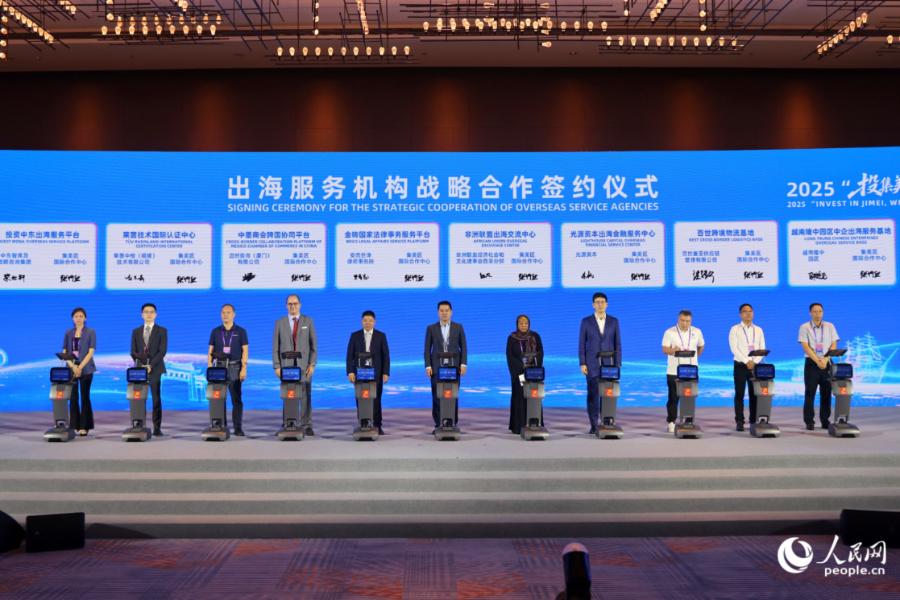 出海服务机构战略合作签约仪式现场。人民网记者 陈博摄 据悉,自2020年首批“投资顾问”聘任以来,集美区招商引资“朋友圈”持续扩大,投资顾问积极发挥行业影响力,为区域产业规划与项目引进建言献策,对经济社会发展贡献显著。此次集美区“智囊团”再吸纳21位来自不同行业的企业家代表作为新一批投资顾问,他们将积极发挥桥梁与参谋作用,为集美引资引智、链接资源,推动更多企业认识集美、扎根集美。