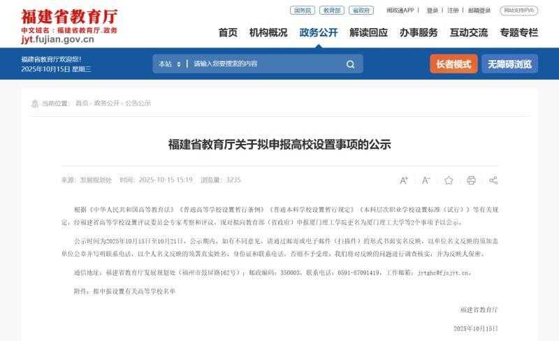 东南网10月15日讯(本网记者 李霖)福建省教育厅10月15日发布公示,拟向教育部(省政府)申报厦门理工学院更名为厦门理工大学。 公示显示,厦门理工学院更名大学的事项已通过福建省高等学校设置评议委员会专家的考察和评议,正式进入向教育部(省政府)申报的阶段。公示期为2025年10月15日至10月21日,共7天。期内,单位和个人均可通过邮寄或电子邮件方式书面实名反映意见。 据悉,厦门理工学院的前身是鹭江职业大学,诞生于1981年10月15日,与厦门经济特区同年同月同日诞生。2004年,经教育部批准,学校升格为本科院校并更名为厦门理工学院。 今年3月,福建省教育厅在回复市民咨询时明确表示,厦门理工学院“已经基本符合更名大学条件”,更名工作已列入《福建省高等学校设置“十四五”规划》。 据厦门理工学院官网介绍,该校是福建省人民政府举办的公立本科高校,位于厦门市。学校占地面积1500多亩,实行“省市共建、以市为主”的管理体制,是福建省重点建设高校、省A类一流应用型建设高校、省博士学位授予单位培育项目建设高校。