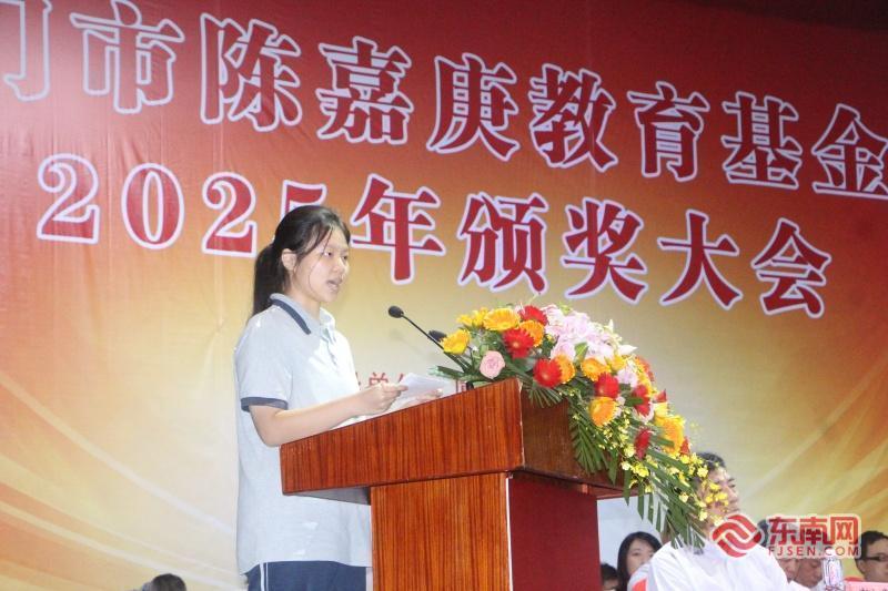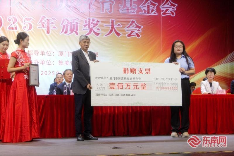 厦门市陈嘉庚教育基金会2025年颁奖大会(东南网记者 李霖 摄) 东南网10月22日讯(本网记者 李霖)10月22日上午,厦门市陈嘉庚教育基金会2025年颁奖大会在福南堂举办,表彰了本年度获得集美学村奖教、奖学金的866名师生。厦门市政府原副市长、厦门市政协原副主席、市教育基金会原理事长潘世建,陈嘉庚先生长孙陈立人等出席活动。 据悉,经严格推荐评审,本学年度,集美大学翁武银、集美大学庄赟、集美工业学校席鑫宁、集美中学张雪琼4位教师获得集美学村奖教突出贡献奖,集美学村各校73名优秀教师获得奖教金,789名优秀学生获得奖学金。 作为表彰集美学村各校优秀师生的专项奖教奖学金,集美学村奖教、奖学金于1989年设立至今已经36年。厦门市委统战部部务会成员、二级巡视员陈善志致辞表示,陈嘉庚教育基金会在集美学村各院校及集美区属各校持续开展奖学奖教活动,累计奖励资助师生20836人次,在全社会树立了尊师重教、崇文尚学的良好风尚,生动诠释了陈嘉庚先生“教育为立国之本,兴学乃国民天职”的精神内涵。 36年来,奖教奖学项目见证了一代代教师践行教育使命,一批批学生成长成材,被老师同学们亲切地称为“嘉庚奖”。集美学村奖教突出贡献奖获得者之一、集美大学教师庄赟表示,将继续用实际行动继续弘扬嘉庚精神,坚守平凡的教育岗位上,不辜负“人民教师”光荣称号。集美工业学校获奖学生张彦钦说,未来,将用所学的知识和技能回馈母校、奉献社会、报效国家,将嘉庚先生的大爱精神传承下去。 “教育是一场跨越时空、薪火相传的接力,每个人都要跑好属于自己的一棒。我们希望通过奖教奖学项目,以点滴之力,续写嘉庚先生教育思想,让辛勤耕耘的教师获得认可与鼓舞,为奋进向上的学子点亮前行的灯盏。”厦门国贸控股集团有限公司原董事长、党委书记何福龙表示。 大会现场还为向陈嘉庚教育基金会捐赠了100万元的爱心企业——临晟(福建)集团有限公司颁发捐赠证书。