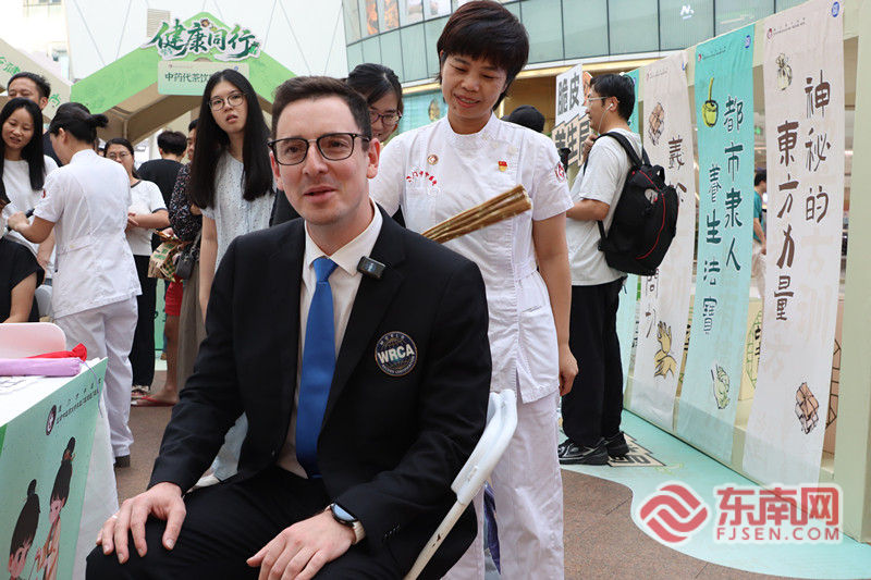 世界纪录认证官马克西姆体验桑枝棒特色疗法(东南网记者 刘学佳 摄)