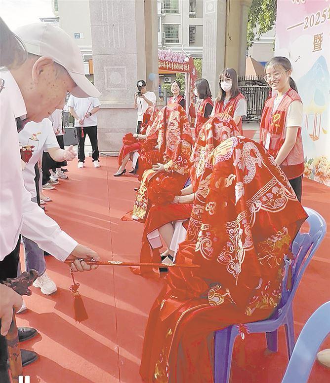 “就是你!”81岁的廖代舜第一个拿起喜秤,果断往前挑起老伴的红盖头。在“千里姻缘”找新娘游戏中,廖代舜的好眼力,让露脸后的妻子罗碧珠哈哈大笑。昨日下午,情暖重阳·挚爱九载——2025年思明区莲前街道侨福社区第九季金婚银婚幸福秀在福满山庄广场温情上演。 “千里姻缘”找新娘、“相敬如宾”夫妻对拜、“相濡以沫”喝交杯酒、“契约今生”签婚书——六对婚龄40年以上的社区长者夫妻在传统又浪漫的婚俗仪式中度过了难忘的重阳节。 廖代舜和罗碧珠是活动中婚龄最高的夫妻。结婚54年的他们一到现场,就被邻居竖起大拇指夸赞:“真水啊!”(闽南话“真漂亮”)。廖代舜一身白衬衫搭配西装裤,精气神十足,75岁的罗碧珠则是第一次穿上中式结婚礼服龙凤褂。“当年结婚时条件不好,这次社区为老人举办婚礼仪式让我们心里暖烘烘的。”罗碧珠说。 侨福社区党委书记叶志娥介绍,社区工作者在走访中发现,不少长者夫妻没有结婚照,也没有办过结婚仪式,所以,社区为他们弥补遗憾,在特殊的日子里让他们成为舞台上的主角,给足仪式感。 如今,侨福社区“金婚银婚幸福秀”活动已步入第九个年头,逐渐成为社区敬老品牌活动。在婚礼仪式前,社区为长者夫妻拍摄了婚纱照,爱心企业地丰置业也为他们送上节日礼品。(记者 吴燕如 摄影报道) |