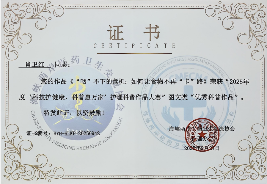 近日,我院荣获由海峡两岸医药卫生交流协会护理分会举办的2025 年度护理科普作品大赛图文类优秀科普作品。