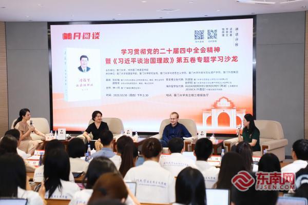 “月·阅·谈”学习明理活动走进厦门大学(厦大供图) 东南网10月31日讯(本网记者 刘玮)昨日,第50场“月·阅·谈”学习明理活动走进厦门大学。本期活动围绕学习贯彻党的二十届四中全会精神和《习近平谈治国理政》第五卷,通过走进厦门大学博士生课堂、外国留学生课堂,开展专题学习沙龙。活动配套同步在新华社现场云、厦门大学视频号等网络平台直播,线上累计浏览量超500万人次。 本期活动分为两个篇章进行,通过“讲、读、评、荐”四个环节展开,以导师与学生对话沙龙形式,邀请理论嘉宾华侨大学科研院院长、教授薛秀军,厦门大学马克思主义学院党委书记、教授石红梅,与青年博士生代表刘进旭、白宇翔,以及海外留学生代表韩诚、叶茜容(中文名)展开深入学习研讨和互动交流。 在第一篇章,薛秀军聚焦发展新时代中国特色社会主义文化这一主题,围绕坚持“两个结合”,巩固文化主体性,结合党的二十届四中全会精神和厦门具体实践进行深入阐述。两位青年博士生代表将理论学习与自身专业结合,分别畅谈了对于深化党的创新理论体系化学理化研究阐释、加快建设文化强国方面的思考与理解。在第二篇章,石红梅以党的二十届四中全会指出的高质量共建“一带一路”为主线,重点围绕习近平总书记关于四大全球倡议、构建人类命运共同体、携手推进现代化、实现共同繁荣的重要论述,阐释了中国式现代化的中国特色和世界意义。来自土库曼斯坦和印度尼西亚的海外留学生代表用流利的中文,结合来华求学经历和亲身体验分享了本国在参与共建“一带一路”的成效,对中国方案、中国智慧和中国式现代化赋能经济全球化有了更深刻的理解。 这堂鲜活的理论学习让厦大学子受益匪浅。大家纷纷表示,将继续深入学习、切实贯彻党的二十届四中全会精神,深学细悟《习近平谈治国理政》第五卷,为奋力开创中国式现代化建设新局面贡献智慧和力量。 活动由厦门大学、厦门市委宣传部主办,厦门大学党委宣传部、厦门大学研究生院、厦门大学马克思主义学院、厦门大学历史与文化遗产学院、厦门外图集团联合承办。 |
