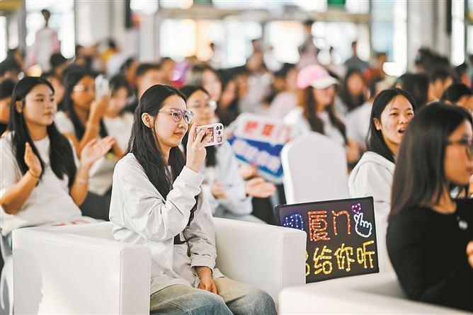 现场歌迷观众沉浸式欣赏演出。(记者 林铭鸿 摄) 厦门日报讯(记者 何无痕)昨日下午,作为第十六届海峡两岸(厦门)文化产业博览交易会的重要组成部分,“把厦门唱给你听”(第二季)两岸青春歌会在厦门开唱。在这场以音乐为纽带的歌会上,两岸青年歌手与厦门高校师生用歌声传递热爱、联结情谊,为文博会注入青春活力。 歌会开场,两岸歌手带来的闽南话歌曲《追追追》点燃现场,用乡音拉近两岸观众距离。随后,厦门演艺职业学院学子轮番登场,演唱《如愿》等歌曲,以深情唱腔诠释两岸情缘。宝岛歌手的表演同样亮眼:芝芝演唱经典《我的心里只有你没有他》,禹瑄带来融合闽南戏曲风情的《凤求凰》;王建杰献上《真情无限》《萧维》两首原创作品。厦门音乐广播主持人也献上诚意演出。 歌会设置两轮“听歌猜歌名”互动环节,让现场气氛持续升温。现场观众踊跃参与,准确答出两岸经典老歌歌名,尽显对音乐的热爱。据悉,该歌会已成为两岸青年以乐会友、传递真情的重要平台之一,让好音乐跨越海峡、触达更多人。 |