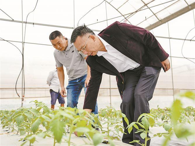 嘉力和农业科技示范园的温室大棚里,园区负责人洪再选(右一)正在检查苗株。