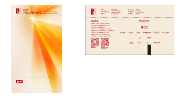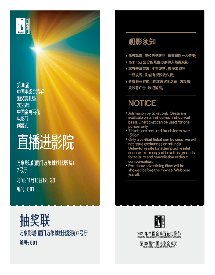 01.光影之约 2025年中国金鸡百花电影节金鸡影展将于11月8日至11月30日进行系列电影展映活动,影展于11月3日12:00在大麦淘票票正式开票。 一年一度的“光影之约”即将全城启幕,金鸡影展共将展映影片158部,厦门20家合作影城将开启放映,让各区观众共享光影盛宴。不仅可以第一时间大饱眼福中外电影,还有机会参与首映礼或主创映后交流活动,近距离和喜欢的电影人互动交流。 今年,金鸡影展为20家合作影城印制了专属票纸,影迷们手上的票根福利效应逐步放大,不仅可享受金鸡影展票根指定兑换福利,还可凭票根享受全城联动福利,你可以一边打卡城市光影特色场景,还可凭票根前往全市联动商家、景区等享受指定优惠福利,真正玩转一回文旅商消费新玩法,快来PICK你的光影仪式感吧。