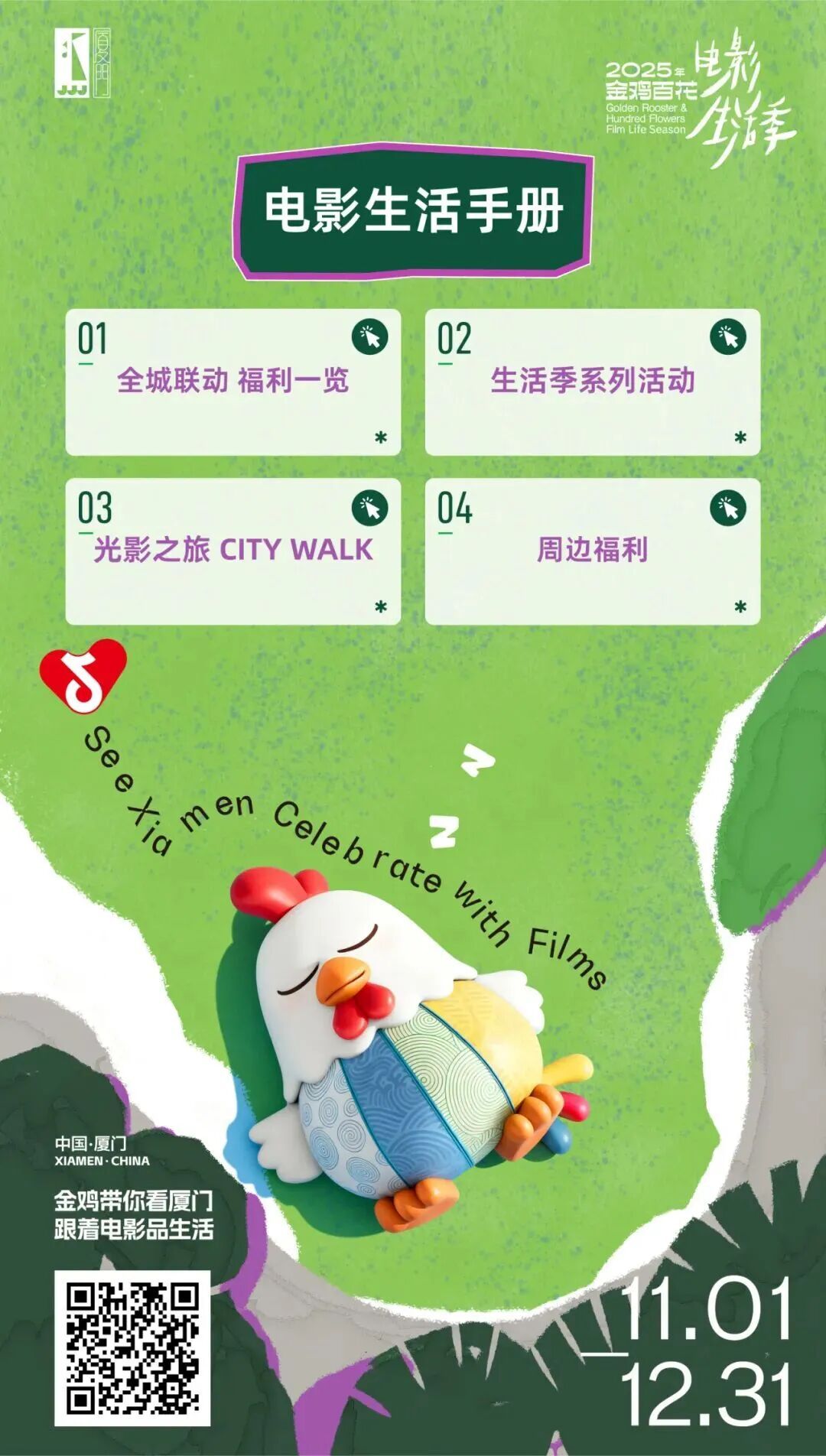 在这个属于电影的美好季节,我们不仅是观众,更是探索城市光影的旅人!厦门有分布于城市各角落的影视拍摄打卡地,有咖啡茶香、市井温度,有传统韵味、现代潮流,厦门市文旅局特别为来厦影迷观众推荐十条影视打卡路线,让我们一起开启不期而遇的光影CITY WALK。 06.电影生活手册 本次2025年金鸡百花电影生活季专门设计制作了《电影生活手册》,将观影活动与城市文旅元素有机融合,为影迷们带来城市文旅商生活方式福利指南。 电子手册包括展映及影城信息、票根福利指南、“金鸡带你看厦门·跟着电影品生活”光影之旅CITY WALK攻略、全城商家联动福利等,影迷和市民游客都可以解锁影展期间的全城联动玩法。