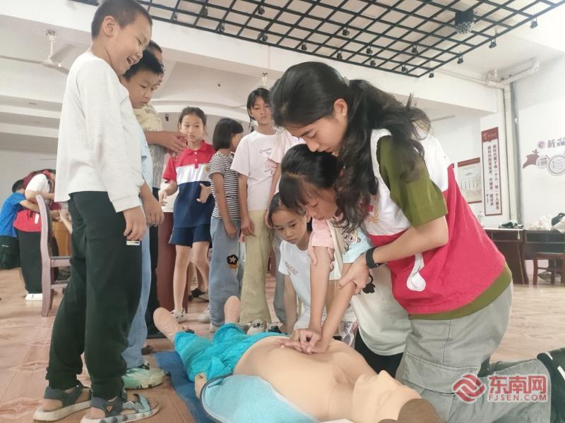 志愿者老师引导孩子体验操作心肺复苏(李林村新时代文明实践站供图)