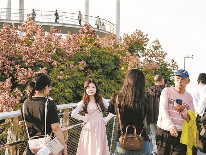 山海健康步道沿线栾树花盛开,众多市民开心打卡。(记者 卢剑豪 摄)
