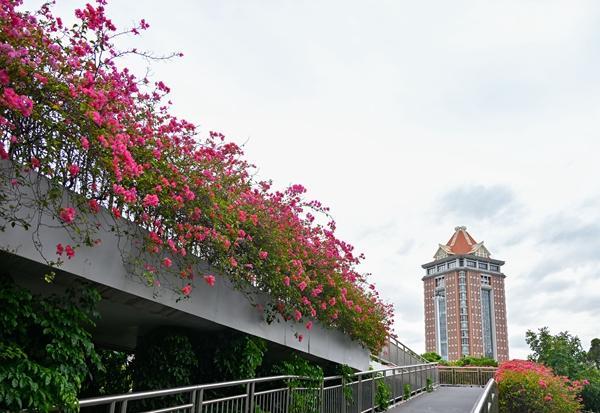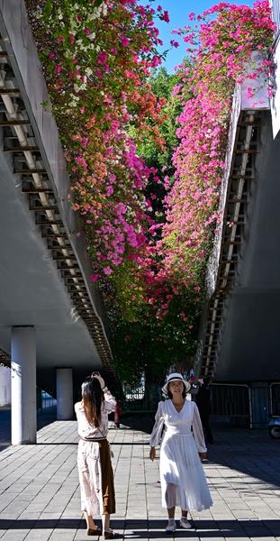 颜色各异的三角梅竞相绽放,高浦人行天桥成为“三角梅花廊”。 粉红、橙黄等颜色各异的三角梅竞相绽放,将天桥、高架桥装扮成“三角梅花廊”……近日来,高浦人行天桥、滨水人行天桥等地成了网红打卡地,吸引众多市民、游客前来参观拍照。 记者来到高浦人行天桥,抬眼望去,虬枝翠蔓编织成花廊,团团簇簇的花片如蝶翼翩跹;微风拂过,花枝轻摇洒落芬芳,行人穿行其间,仿佛步入空中花隧道,美不胜收。 不仅高浦人行天桥三角梅花开如画,这抹“亮色”也在集美多地迤逦蔓延——集美大道滨水人行天桥,繁花则似朝霞栖落枝头;杏南路高架桥,三角梅如红绸舞动;杏锦路人行天桥,花带与川流不息的车流相映成趣。 管养单位集美市政集团园林公司现场负责人介绍说,为确保三角梅开花效果,他们结合秋季适当控水和催花,让三角梅得以“花期集中、花量丰盛”,预计花期可持续至12月底。(文/图 记者 林志杰 来源:集美报)