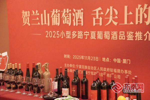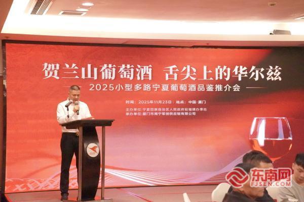宁夏葡萄酒品鉴推介活动现场(主办方供图) 东南网11月24日讯(本网记者 刘玮)东西协作山海情,闽宁携手谱新篇。近日,一场以“贺兰山东麓葡萄酒·舌尖上的华尔兹”为主题的多形式品鉴推介活动在厦门举行。来自宁夏贺兰山东麓产区的佳酿跨越山海,与滨海鹭岛浪漫邂逅,为深化两地产业协作、续写“山海情”注入了馥郁芬芳。 本次活动聚焦贺兰山东麓葡萄酒这一“紫色名片”,旨在通过品鉴交流,进一步拓展闽宁协作的深度与广度。现场重点推介了产自贺兰山东麓的多款葡萄酒。这些酒品充分展现了该产区独特的风土条件——得益于黄金纬度的优越气候与黄河水的滋养,成就了其酒体醇厚、香气层次丰富的典型东方风格,为与会嘉宾带来了一场难忘的味觉盛宴。