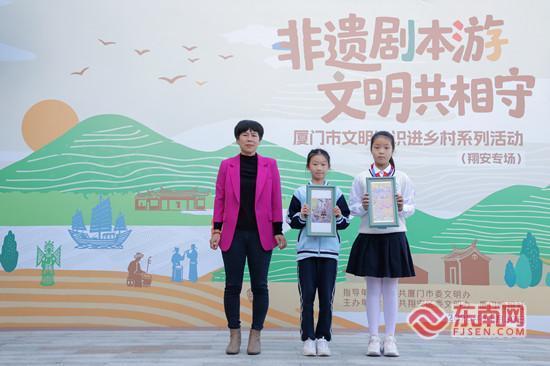 非遗传承人向两所学校学生代表赠送农民画(翔安区委文明办供图)