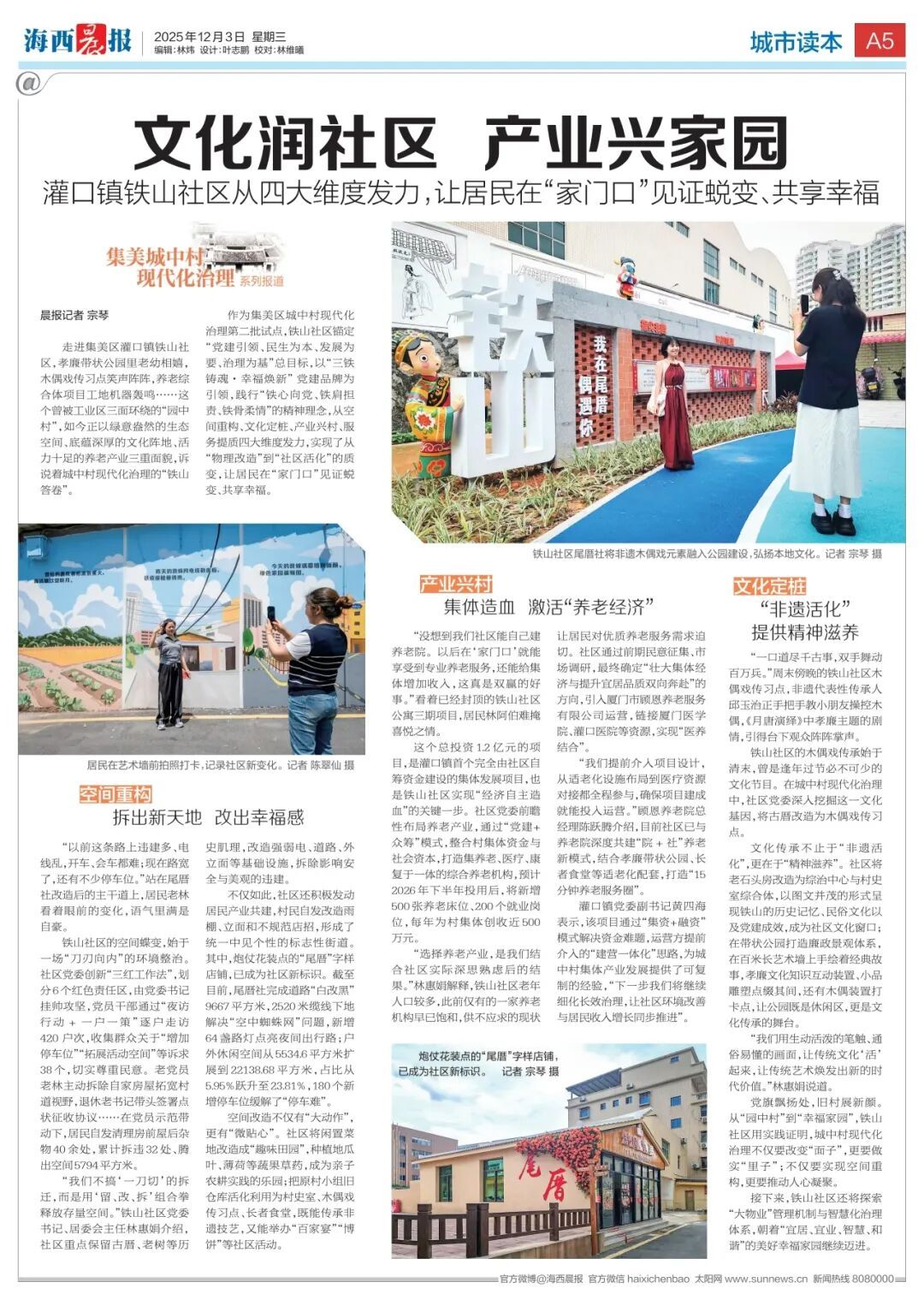 走进集美区灌口镇铁山社区,孝廉带状公园里老幼相嬉,木偶戏传习点笑声阵阵,养老综合体项目工地机器轰鸣……这个曾被工业区三面环绕的“园中村”,如今正以绿意盎然的生态空间、底蕴深厚的文化阵地、活力十足的养老产业三重面貌,诉说着城中村现代化治理的“铁山答卷”。 作为集美区城中村现代化治理第二批试点,铁山社区锚定“党建引领、民生为本、发展为要、治理为基”总目标,以“三铁铸魂・幸福焕新”党建品牌为引领,践行“铁心向党、铁肩担责、铁骨柔情”的精神理念,从空间重构、文化定桩、产业兴村、服务提质四大维度发力,实现了从“物理改造”到“社区活化”的质变,让居民在“家门口”见证蜕变、共享幸福。