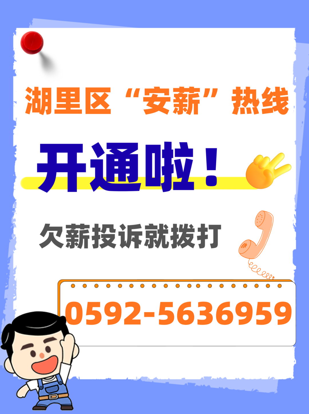 投诉后,工作人员会怎么处理? 专人接听并登记完诉求后,会迅速流转至专业执法人员,执法人员将全程跟办。 什么时间可以拨打“安薪”热线? 即日起至2026年春节前 周一到周日8:30-21:00 不方便打电话,怎么投诉? 线上:搜索并关注“湖里人社”公众号→点击菜单栏“互动交流”→“欠薪投诉专栏”,无需注册,可直接登记投诉信息。 线下:湖里区枋湖南路29号9楼(湖里区政务服务中心)。 交通路线:地铁3号线安兜站;公交湖里老年活动中心站(7、428路)等多条线路。 也可就近到各综治中心寻求帮助 湖里区综治中心 联系地址:湖里区汤坂里29号 联系电话:0592-6030148 湖里街道综治中心 联系地址:湖里区南山西路551号一楼 联系电话:0592-6028531 殿前街道综治中心 联系地址:湖里区长浩路223号西附楼一楼 联系电话:0592-5373110 江头街道综治中心 联系地址:湖里区台湾街289号一楼 联系电话:0592-5570110 禾山街道综治中心 联系地址:湖里区枋湖北二路889号附楼一楼 联系电话:0592-5792701 金山街道综治中心 联系地址:湖里区云顶北路16号一楼 联系电话:0592-5136953 温馨提示