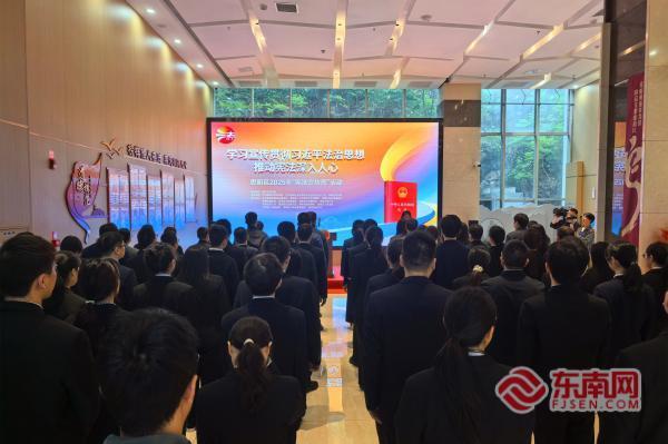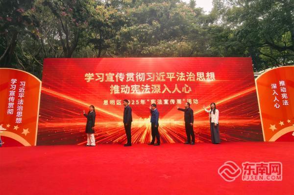 新提任、新入职公务员高举右拳面向宪法庄严宣誓(东南网记者 刘玮 摄) 东南网12月3日讯(本网记者 刘玮 通讯员 吕逗秋)3日,厦门市思明区在思明区图书馆、金榜公园同步举行2025年“宪法宣传周”主场活动,通过宪法宣誓、法治文艺汇演、趣味游园会等“沉浸式”体验,推动宪法精神融入群众生活。本次活动正值第八个“宪法宣传周”(12月1日至7日),呼应“学习宣传贯彻习近平法治思想,推动宪法深入人心”主题,也为12月4日第十二个国家宪法日预热。 活动由厦门市司法局指导,中共思明区委宣传部、区委全面依法治区委员会办公室、区司法局主办,15家单位协办。在思明区图书馆,新提任、新入职公务员整齐列队,高举右拳面向宪法庄严宣誓,铮铮誓言彰显依法履职的担当精神,大家表示将以此次宣誓为起点,为法治思明建设贡献力量。 金榜公园内,伴随着鼓舞《龙腾虎跃》的激昂旋律,“宪法宣传周”启动仪式暨法治文艺演出正式开启。歌曲《法治之光》、闽南非遗答嘴鼓《民法典——学好治百病》、原创法治短剧《永远为你》等八个主题鲜明的节目轮番上演,将宪法精神与非遗文化、青少年生活场景相结合,让市民在欣赏演出中潜移默化接受法治熏陶。