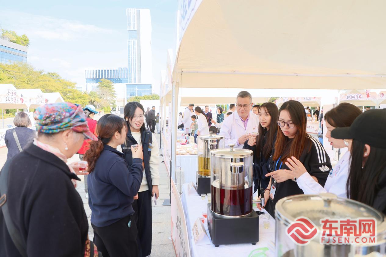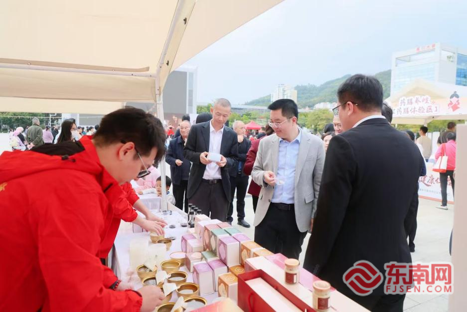 厦门市中医院党委书记蔡成福(右二)参观合作企业展示摊位(主办方供图) 中医药文创与药膳产品展示区同样吸引了大量市民驻足。古法膏方、节气养生汤包、便携养生茶饮、中药香囊香珠等产品琳琅满目,均详细标注核心药材、养生功效及适配体质,现场提供试吃、试饮、试戴服务。工作人员耐心解答市民咨询,让中医药养生理念真正融入日常生活。