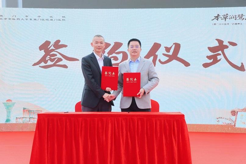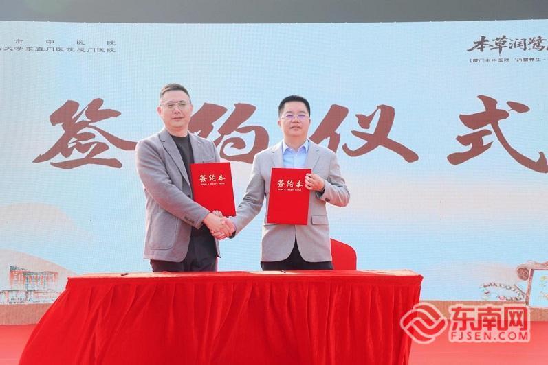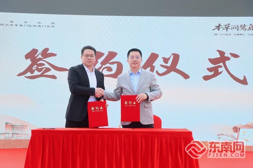 厦门市中医院党委书记蔡成福、古檀树药业(厦门)有限公司董事长林振远(图左)分别代表医院与公司签订合作协议(主办方供图)