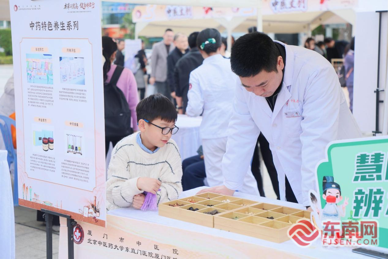 市民踊跃参与中医猜谜送福活动(主办方供图) 文化科普“接地气”,市民现场边问边学 文化科普区是此次嘉年华的“知识高地”,人气持续高涨。“药食同源”药材标本墙、厦门十大青草药展示区、闽南特色中草药知识墙整齐陈列,20余种常见药材搭配清晰的实物标本与图文说明,详细标注性味、功效及日常食用方法,让市民直观感受闽南大地的本草智慧。带孩子前来体验的李女士感慨:“平时只知道枸杞、山药能养生,今天才系统了解到这么多闽南本地青草药的价值,实物展示的方式特别直观,孩子一边看一边问,不知不觉就学到了不少知识。” 此外,“猜谜送福”活动趣味十足,灯谜内容涵盖中药材辨识、养生常识等,市民踊跃参与抢答,猜对者可兑换中药香囊等文创礼品,市民张先生拿着刚获得的香囊笑着说:“猜灯谜学知识,还能拿到实用的中医药文创,这种传播方式太接地气了!”