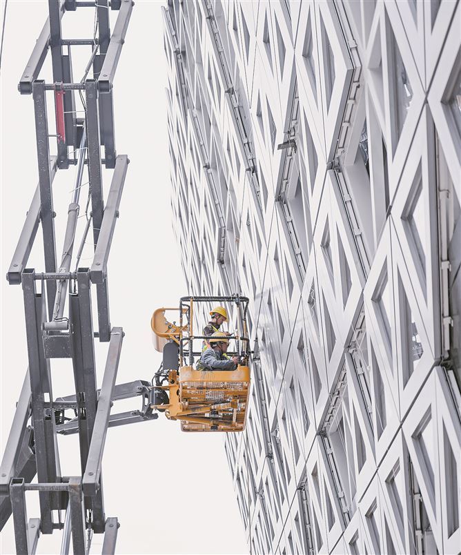 元旦当天,苏颂天文馆建设现场,工人正将一块块一体板面板精准嵌入钢龙骨架中。(厦门日报记者 林铭鸿 摄)