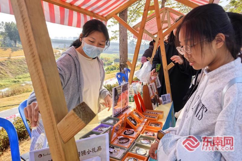 现场展位售卖的手工艺品吸引了很多市民(东南网记者 刘玮 摄) 随后,元气舞蹈、互动魔术与歌曲串烧轮番上演,现场氛围持续升温。舞台部分还特别设置了“厦乡好物推介”环节,多位来自东孚街道的特色农产品商户代表轮番登台,热情洋溢地向现场市民推介自家的“明星产品”。 与之呼应,“海沧风物集”草地灵感市集同样人气高涨。本地玛瑙产品、赤土蜂蜜、东孚花卉绿植、当季草莓等农副产品琳琅满目,暖冬热饮与小食香气诱人。中医院设置的展位不仅推介药膳养生产品,更有医生现场坐镇,提供健康咨询,凸显活动养生内涵。