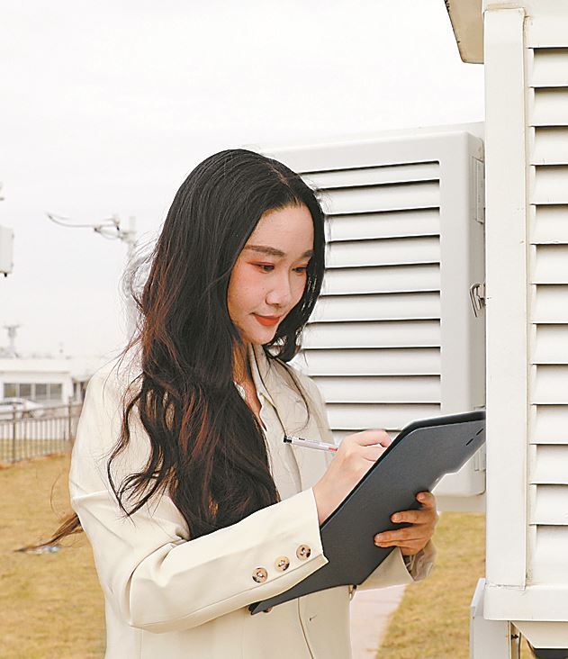 王婧正在进行湿球黑球温度(WBGT)指数观测试验。