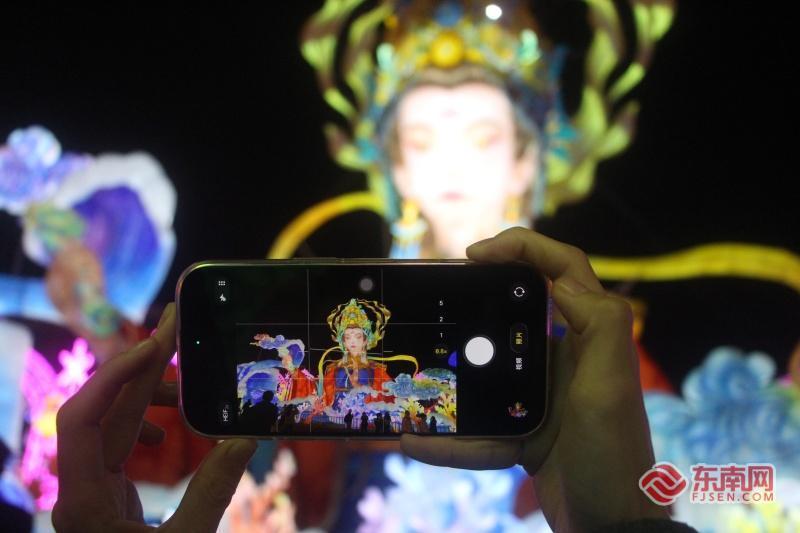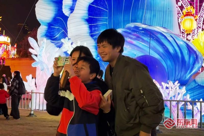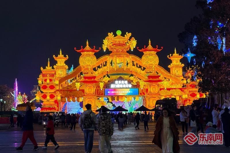 游客与大型水上灯组“桃海仙踪”合影(东南网记者 李霖 摄) 东南网1月31日讯(本网记者 李霖)1月31日晚,厦门园林博览苑化身为一片流动的璀璨星河——“欢乐光域·厦门园博苑灯会”二期正式拉开帷幕,为市民游客献上一场规模空前、声量浩大的夜游光影盛宴,描绘出一幅绚烂的闽南夜画。 九大主题31组灯艺 缔造视觉史诗 园博苑二期灯会项目由厦门文旅集团投资布展,布局“九大主题、31组灯景”,形成层次丰富的光影矩阵。 步入园区,高达23米、宽达40米的“华灯启厦”入园大门以福建传统宫灯为灵感,融汇闽南纹样、郑成功形象及马年祥瑞意象,满载“福”文化深情厚谊,迎接八方宾客。220米长的超大型水上灯组“桃海仙踪”以清代同安船队寻亲故事为蓝本,巨轮、旭日与仙岛神树交相辉映,寓意两岸血脉相连、终将团圆。 “马上得福”传递观灯纳祥的美好寓意,“百鸟归巢”以百鸟盘旋、凤凰展翅展现南音意境,“萤火之森”还原闽南童趣。此外,“怒海宝藏”“白泽献图”“深海智灵”等灯组各具特色,融合立体造型与动态光影,植入互动声光效果,打造沉浸式观灯体验。 本届灯会不仅静态灯组美轮美奂,更规划了水、陆两栖一体的演艺体系,让光影“活”起来、故事“动”起来。全园引入NPC互动体系,角色穿梭其间,与游客吟诗、叙话,共同构筑生动的闽夜风情长卷。